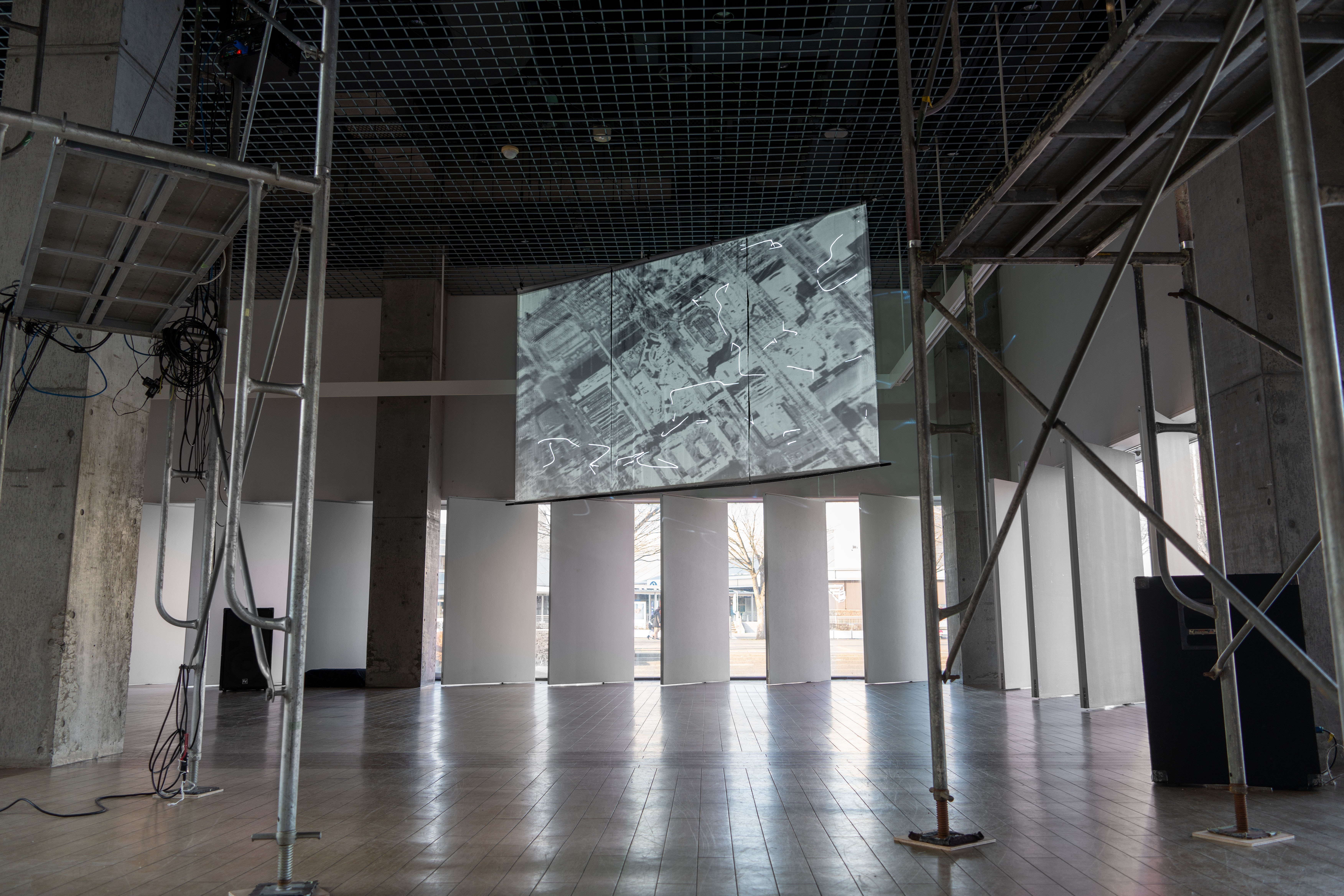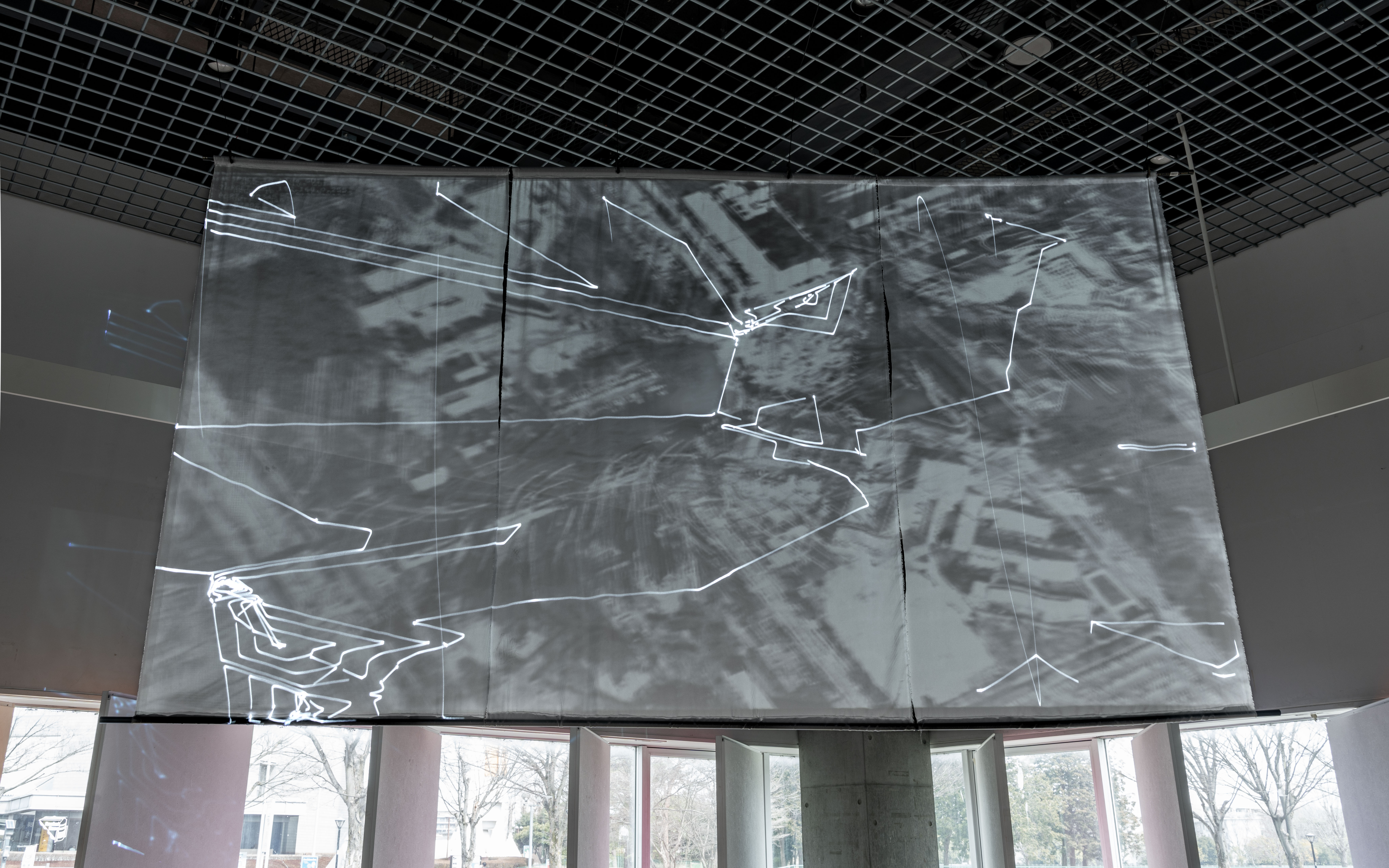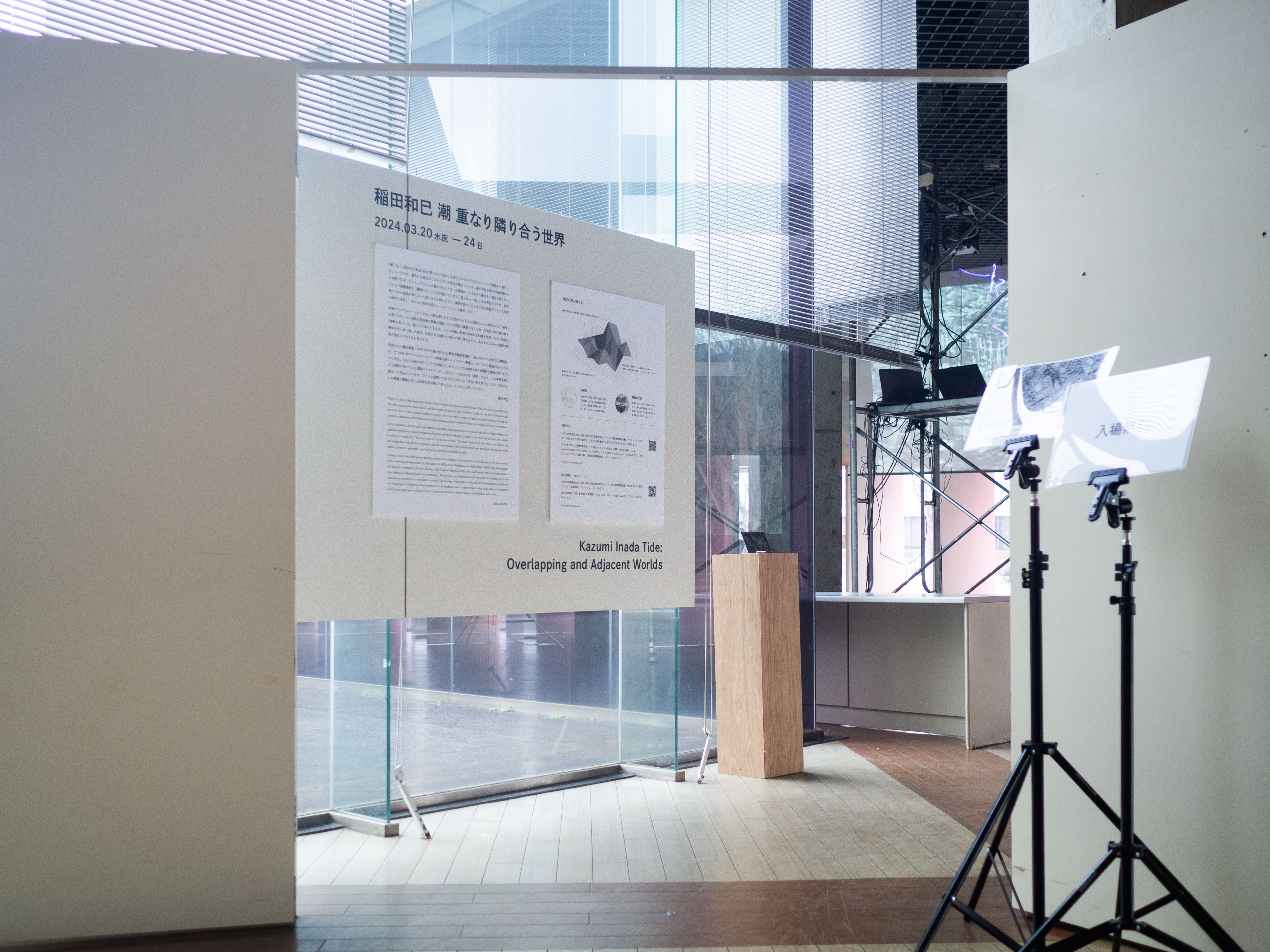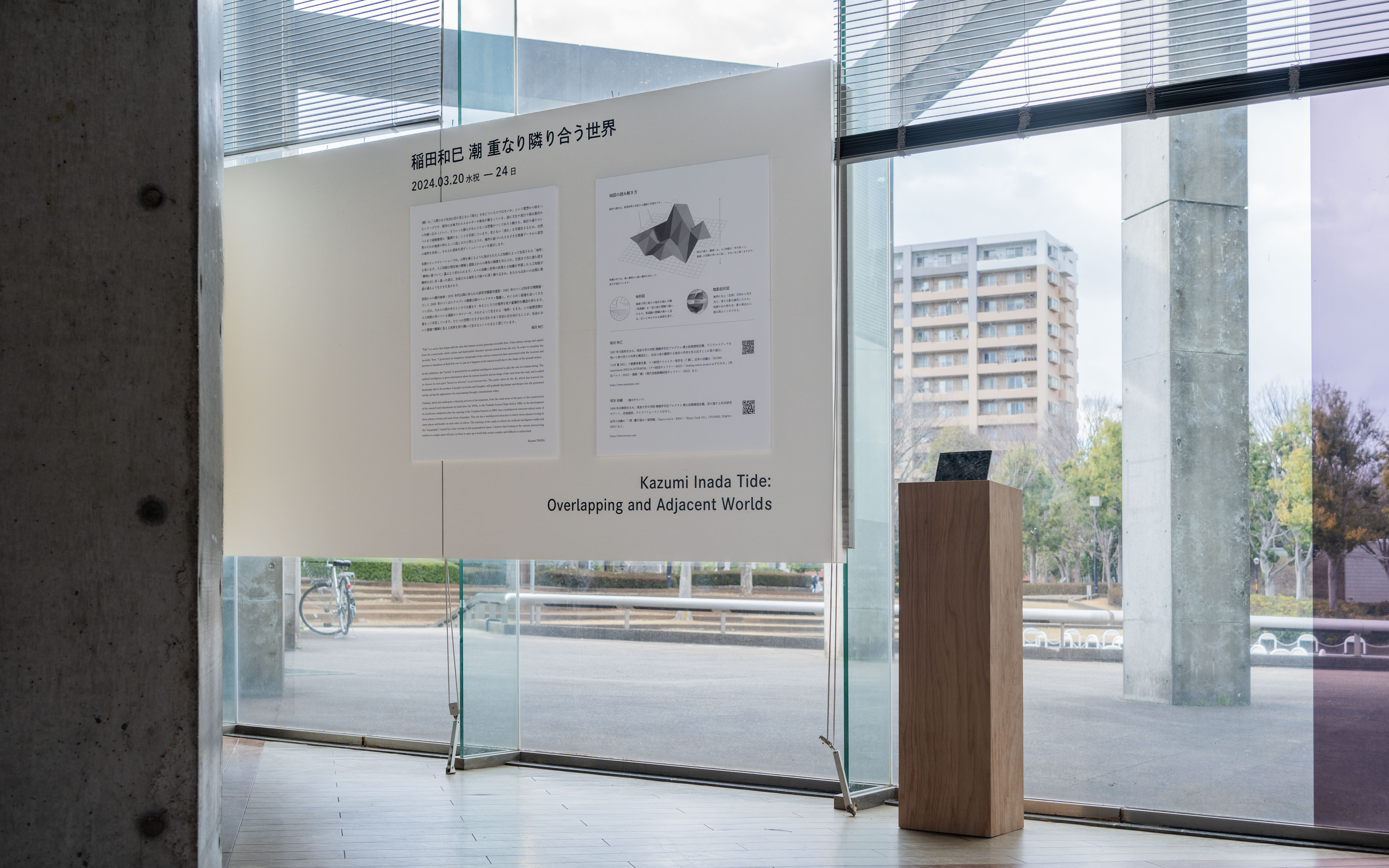 《潮》は、地理空間に紐づくデータを仮想の地形に読み替え、場に横たわる不可視な流れを示すことで、そこに広がる社会の特性を調査する作品シリーズです。本展では、研究学園都市以前の農村や近年開発されるベッドタウンなどさまざまな相を見せるつくばの街を、大規模言語モデルを用いたAIに「歩いて」もらう試みについて、公園のレストハウスを会場にした映像インスタレーションで展示します。