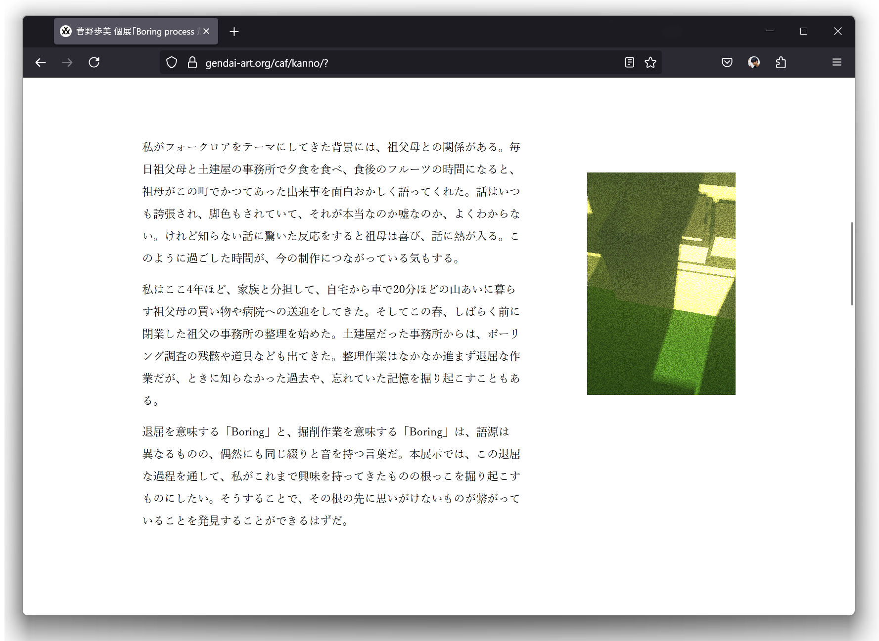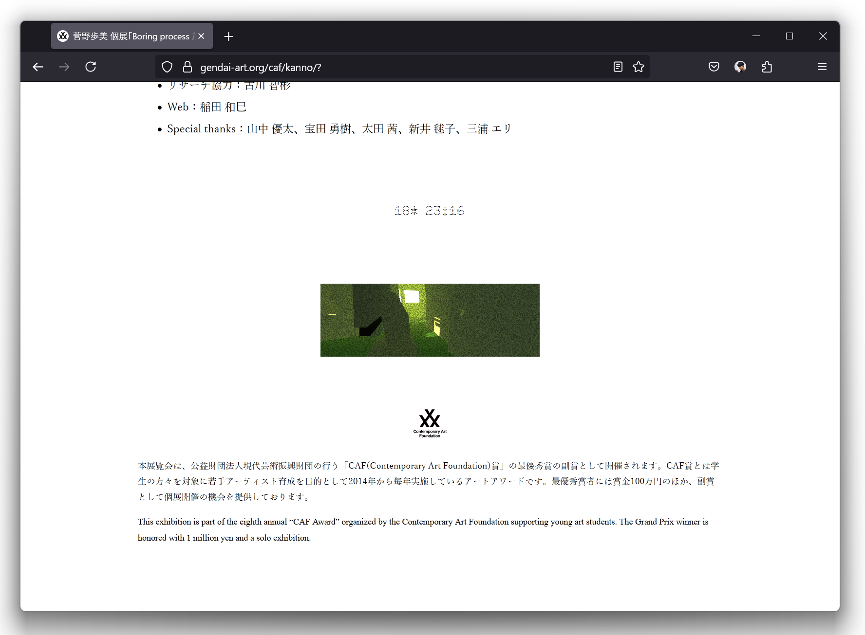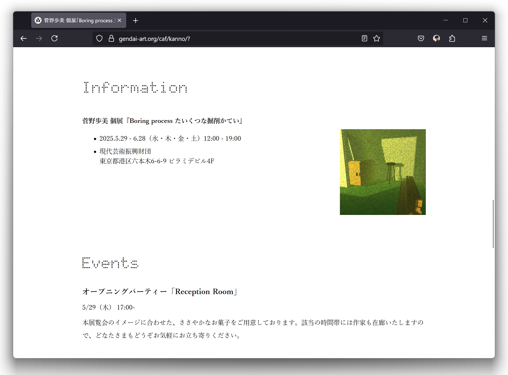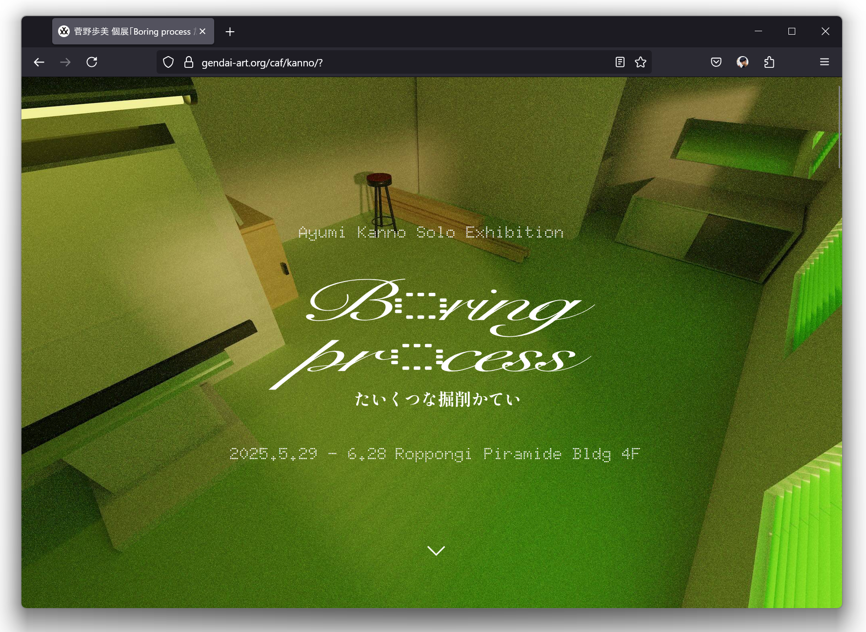 美術家・菅野歩美による個展「Boaring Process たいくつな掘削かてい」のWebサイトのデザイン・実装を担当。3DCGを多用する菅野の作品のデータをWebに取り込み、インタラクティブなギミックとして仕込んだ。