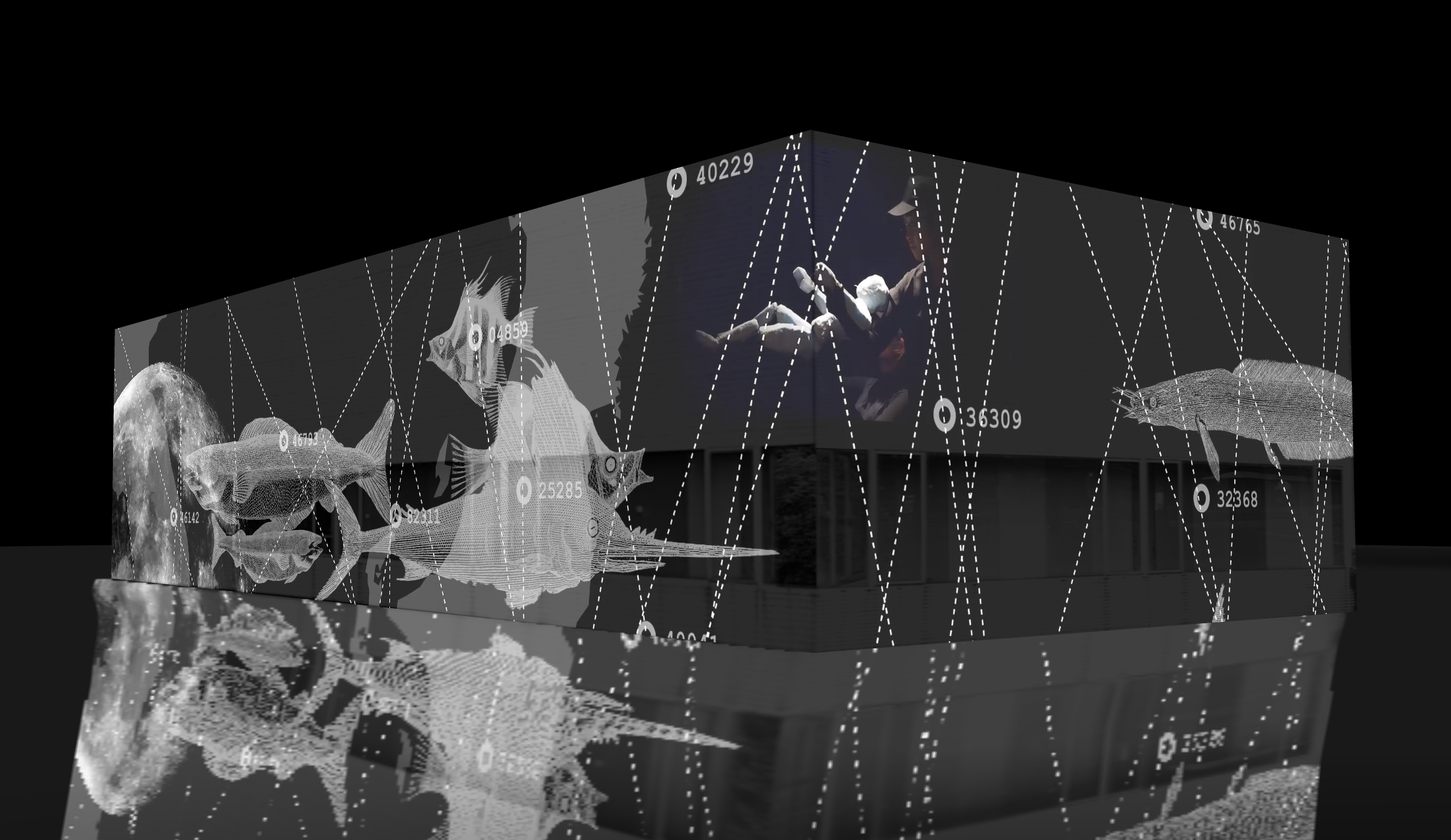 池に沈む塵や落ち葉に、場に横たわる文化・時間・営みの存在を重ね合わせるようにして描くプロジェクションマッピング作品。現実の動きを量り取るためのさまざまなデータをCG映像に変換し、様々な形で重畳しながら見せる。人形を用いたパフォーマンスは文楽の技法を元にして制作した。