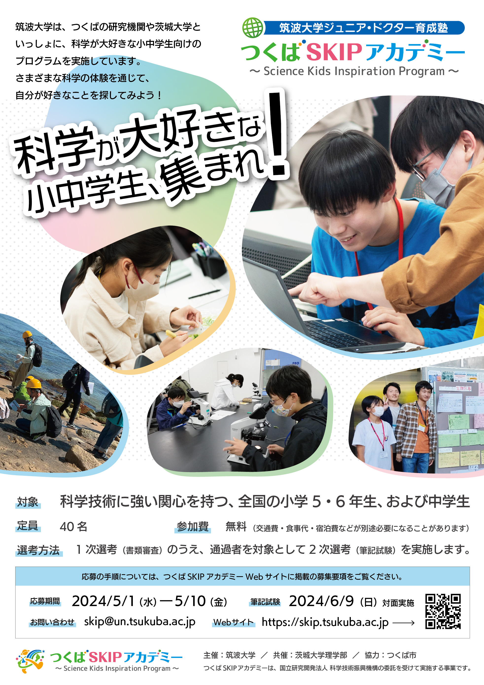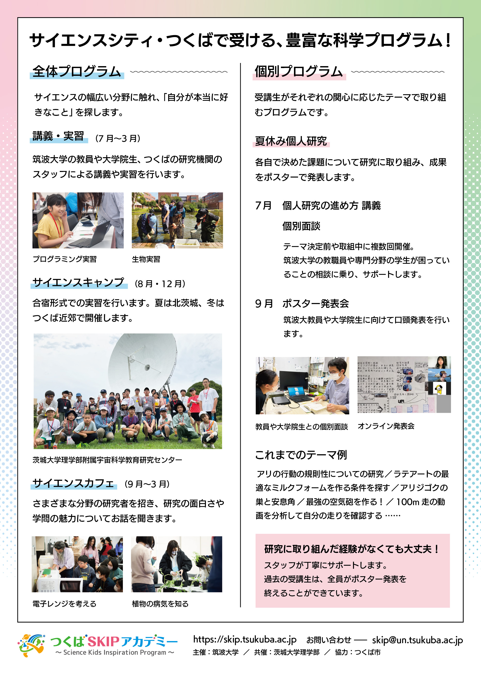 筑波大学の小中学生向け社会連携事業「つくばSKIPアカデミー」の募集フライヤーのデザインを担当しました。