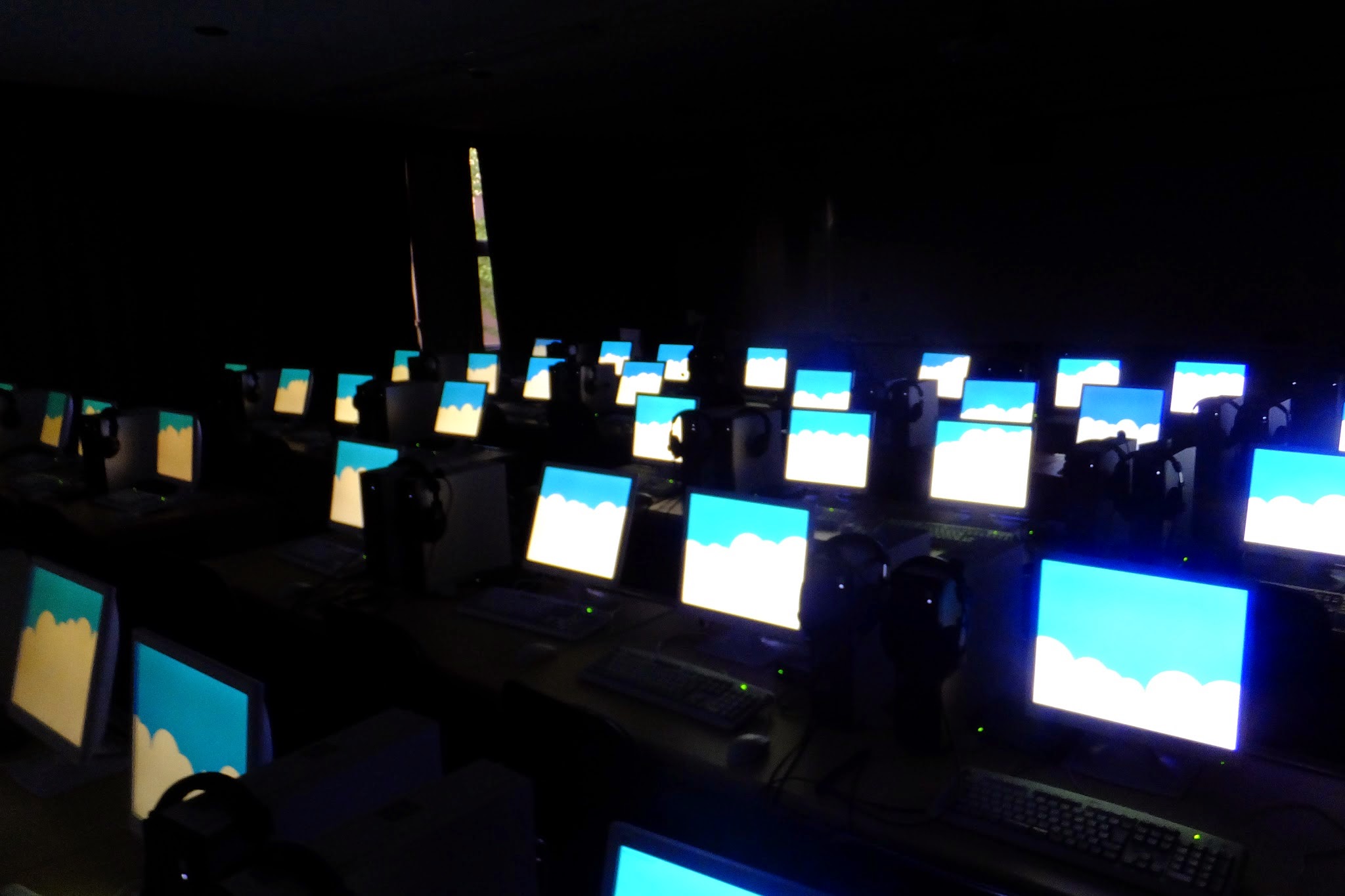 空間に広がる音の可視化表現の実装。40台のコンピュータの動作が同期され、一体となって空間を演出する。