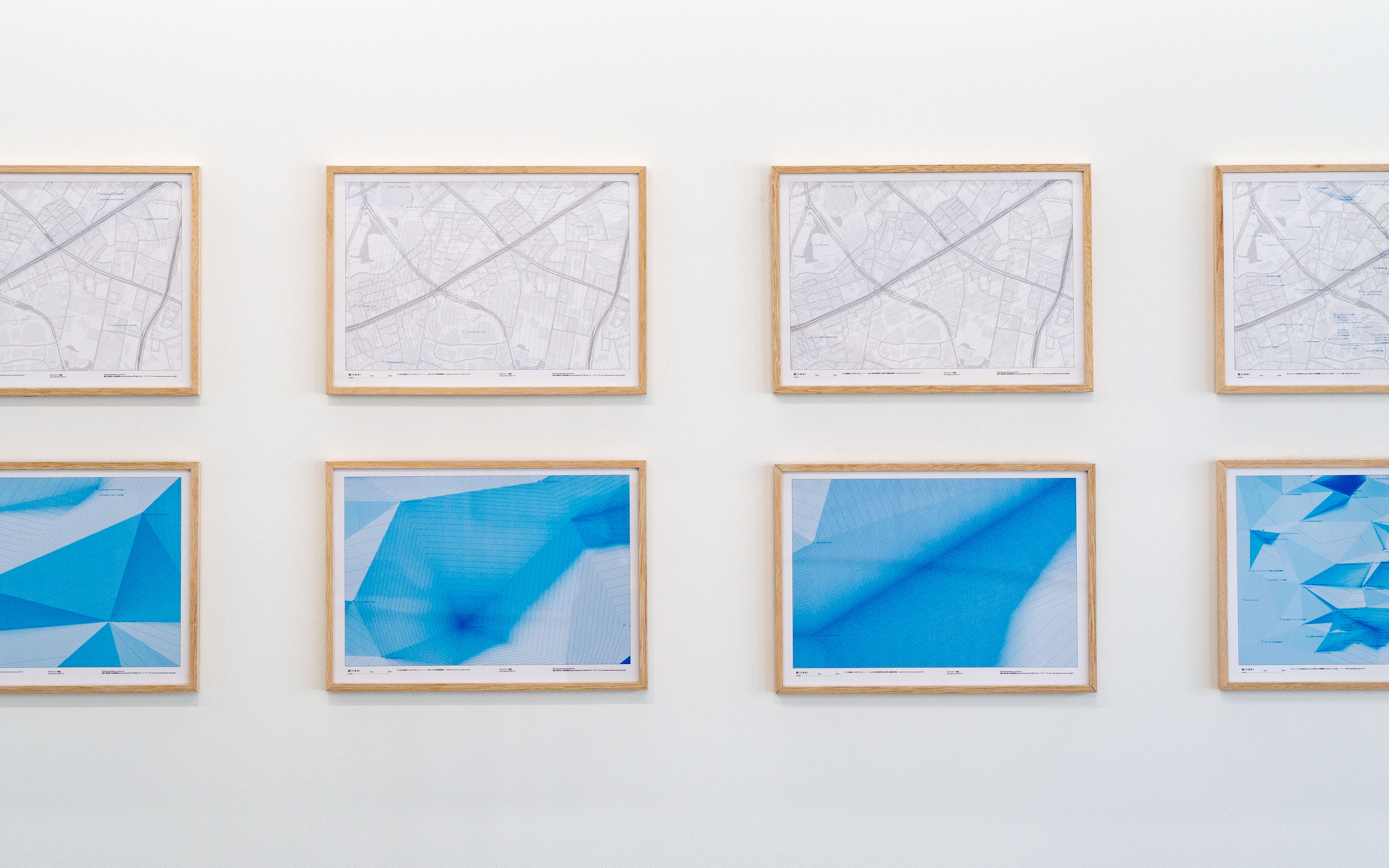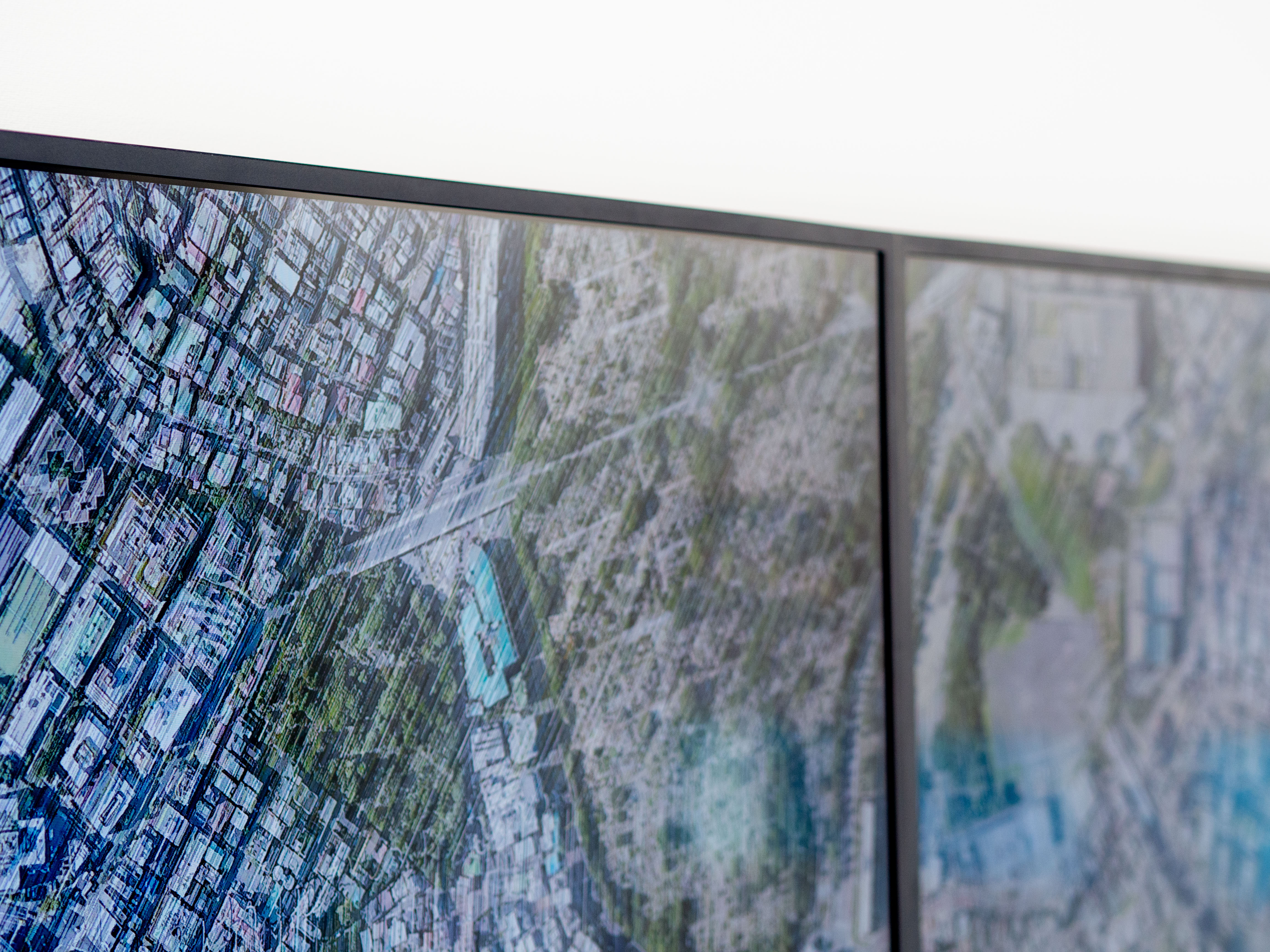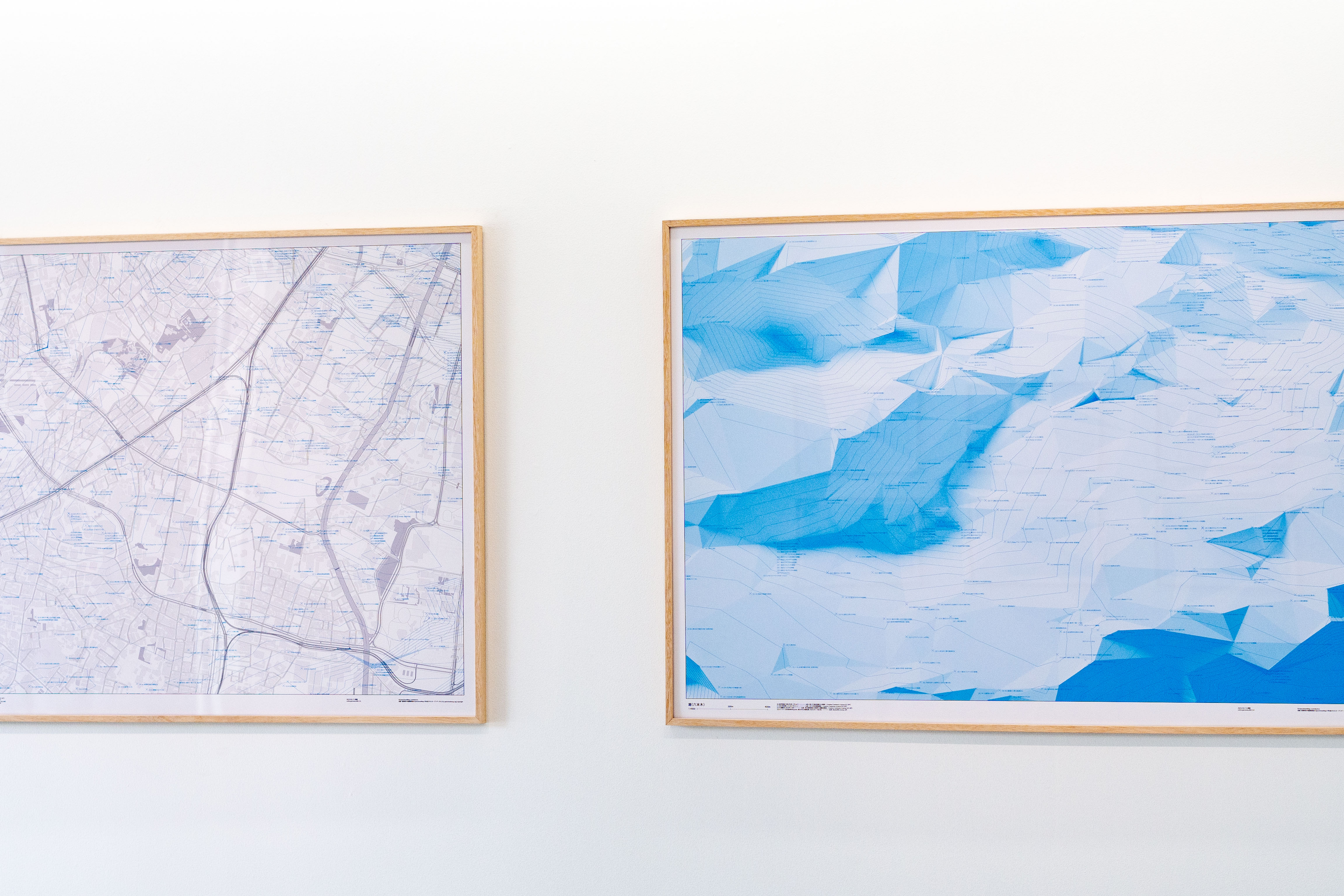 本シリーズの制作は、場所に紐付けることができる社会統計データをそれぞれの地点の「標高」とした、仮想の地形モデルを生成することを核とします。たとえば地価統計のデータでは、統計が取られた地点ごとに、価格の相対的な高低を地形上の高さに変換しています。得られたまばらな点の間を数理的に補完することで、地形の「地面」ができます。展示を構成する作品はすべて同じ単一のモデルの見せ方を、さまざまに変化させて作られています。